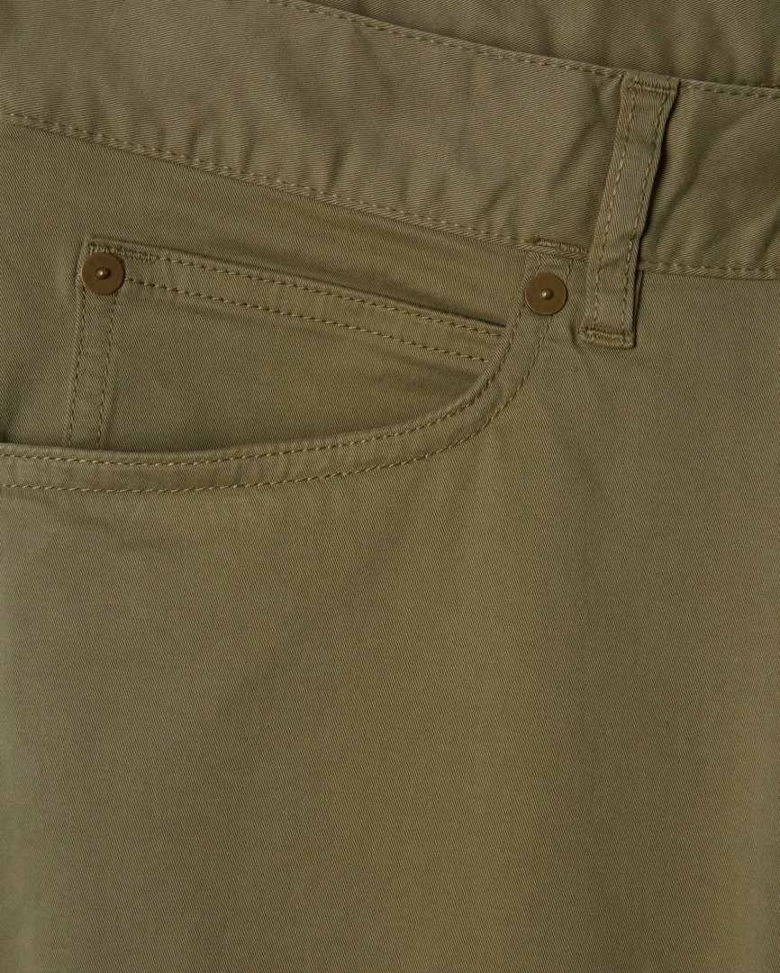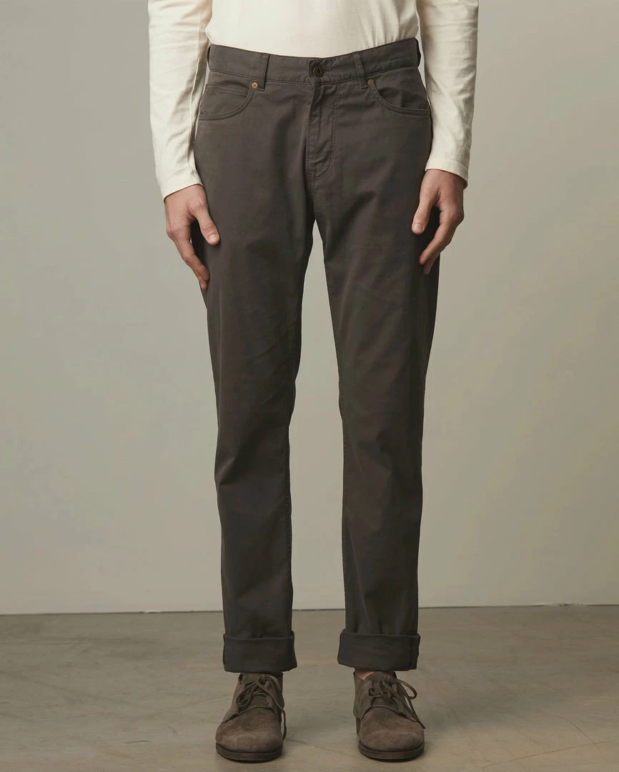 These pants are made in Portugal from cotton with just a hint of stretch, and are garment-dyed for a lived-in look and feel. Finished with unexpectedly luxe details like an antique brass button at the waist, and an embossed leather waistband patch.