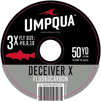 With Best-In-Class knot-strength, abrasion resistance and ultra-low visibility, Deceiver X is the premium standard in fluorocarbon material. A three layered constructions makes for a beautiful working fluorocarbon material all day and everyday use that comes on a 50 yard spool. Deceiver X pays tribute to the original & first fluorocarbon tippet brought to fly-fishing 20 years ago, Umpqua Deceiver. With All spools of Deceiver X come with a custom Grey ProBand to keep tippet at the ready.