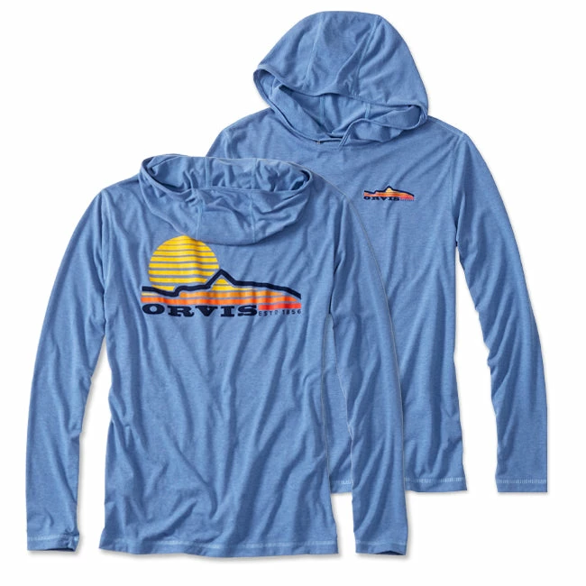 Stay cool and covered in this breezy drirelease hoodie with a colorful mountain sunrise logo on the back. Patented blend of polyester and cotton is naturally moisture wicking and quick drying with no chemical or topical treatments. Dries four times faster than cotton. Soft, natural feel with built-in odor protection. In medium blue. Polyester/cotton. Washable. Imported.