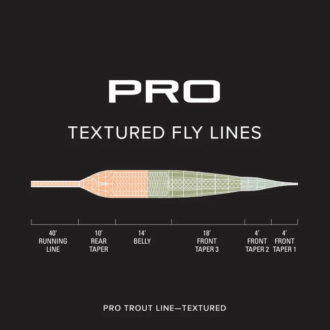 PRO Trout Textured Fly Lines offer increased surface area, allowing the line to sit higher in the water, offering less drag, easier mending, less water spray and easier pick-ups. The micro-textured surface traps air to provide increases in both shootability and floatation while decreasing friction. PRO Trout is designed with advanced compound tapers to be the best all-around trout line available and is the most versatile trout line available for multiple techniques and environments. The 50′ head has a gentle front taper followed by a powerful belly for easy casting and delicate presentation. Longer rear taper is designed for better line control, casting, and on-water mending. 3 wt-6 wt.
